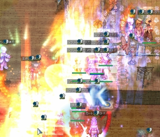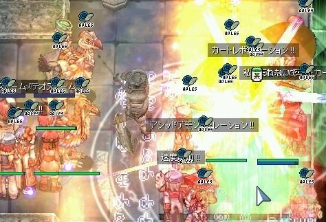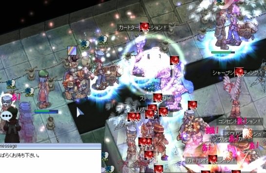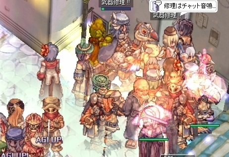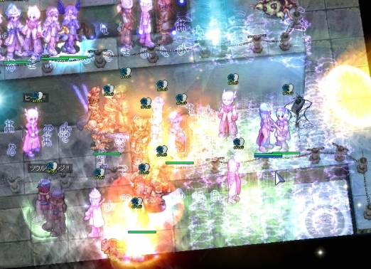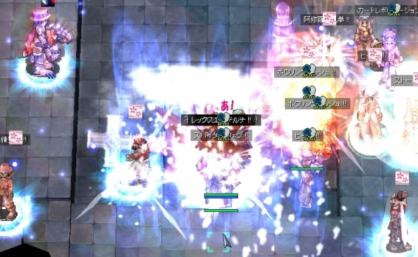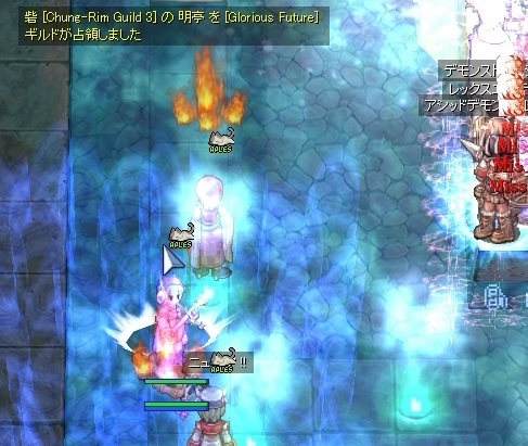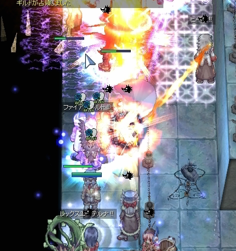 武器をなくして、本当になにもできなくなったわたしでしたが、ギルメンの活躍で制圧を完了。またも、ゆるーい防衛にシフトします。本来なら、ここでWiz地帯にジークを展開するのですが、武器をなくしたわたしは所在なくぽつーんと立ちんぼするしかありません。アクティブスキル全滅って、こんなにひどい扱いだったのかーと凹みつつ、手のしびれが取れるのを待ちます。