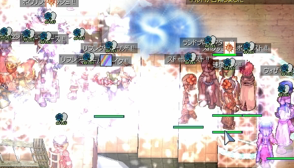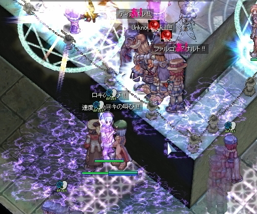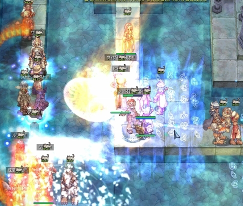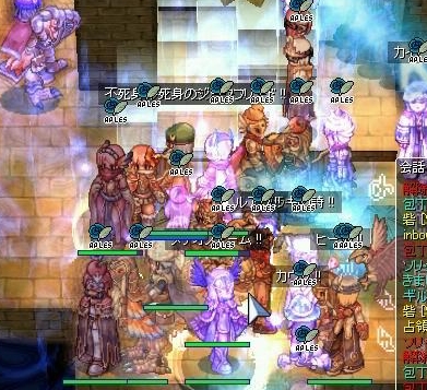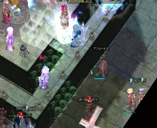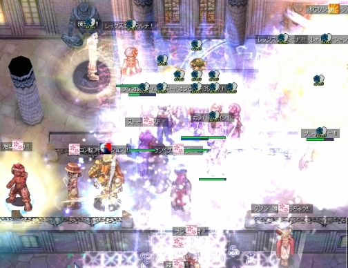 そのまましばらく防衛を維持していましたが、そろそろ乱れ気味。転戦する頃合でしょうか、Wiz地帯も人が少なくなりました。みんな定位置にじっとしてないなぁ。そしてNonさんかな、単騎でエンペまで到達した人がいたので、ジークを解除して忘れないでと永遠の混沌をかぶせてみました。両者とも気休め程度ですが、どうせ遊びだし、許されるでしょう。その他数名の侵入者も対処ができたところで、わたしたちは砦から揃って引き抜かれてしまいました。