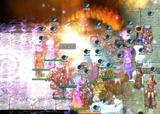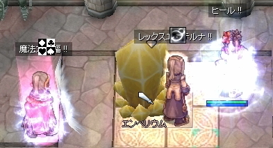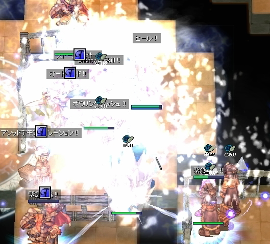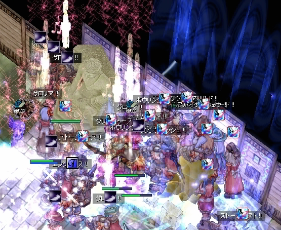 チェイスの人を対処して一息ついたところですが、Wizのブラギが切れたままになっていました。指揮からは遅延解除の予定時刻がアナウンスされますが、直後にPreludeさんのLKが数騎左通路に抜けていきます。大魔法も前衛のヒットストップもない状態で、無傷のまま通過を許した致命的な状態。このままではWiz地帯の壊滅と、エンペを狙われることは確実。割り依頼が飛び、素早くエンペ割りの処置が行われました。