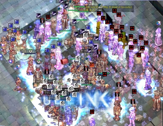 1回目はエンペルームに入った瞬間、エンペが割れて追い出されます。獄煉さん、レーサーギルドかなと思いつつ、確認のため再度L2へ。道中、他所ギルドの人をちらりと見かけたので、クロキンしてからERに潜伏。そこに入ってきたのはEKの人でした。直後に指揮からB2へ行く連絡があり、せっかくなのでエンペを殴る様子を眺めてから追い出されることにしました。