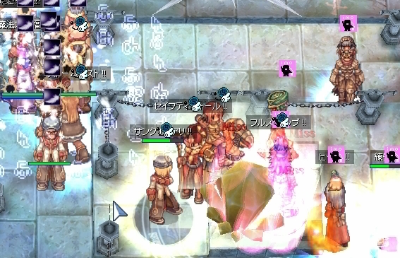 そして数秒後、エンペにも取り付かれていた状態でEmCが通って全員復帰です。こうなれば数名のプリが我先にサンク!!SW!!と傷ついたエンペを守りに入ります。ここで頑張ってくれたのがHWizの人。EmC直後に死にかけているのをなんとかサンクで救済した後は、群がる寄せ手に、じわりとSGをかぶせます。