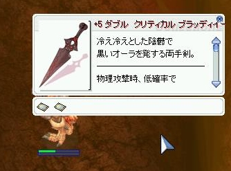 そして突入して10分で壊れる武器…。 なんだか80程度のダメージが定期的に出てるなと思ってたんです。でもキモゴレ倒すのに夢中で気づきませんでした。2HQ切れたな、更新しないとと思ってたらなんだかスキル失敗のメッセージが出るから変だと思ったんです。さすがにゴーレムは素手殴りでは倒せないので一旦離脱。そして月光剣に持ち替えてある程度削っていたMobをBB連打して掃除しました。 武器さえ壊れなければ、経験もそこそこ、ドロップも原石が優秀な狩場なんですけどね。やはり被ダメのほとんどない海底洞窟4F/5Fがいいのかなぁ。 |