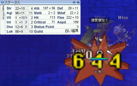 やった、やったよ! 村正に風付与しての伊豆D5狩りですが、通常ダメージ300前後に付与して2倍。途中でシャークハットなどを試しつつ概ね600前後のクリティカルダメージが火力の中心でした。囲まれた際にボーリングバッシュも使いますが、やはりAgiはパッシブ殴りが基本でしょう。そして奥義とは基本を極限まで昇華させたものなのだと師匠も言ってました。って、師匠って誰? 常に脱線する前置きはこれくらいにして、Mobによっては700前後まで上がる与ダメでしたが、保険でかけているオートバーサークが発動すると、これが800に届くんですよね。ただ、伊豆D5でオートバーサークはちょっとリスキーなので常用はできないのが残念なところ。伊豆D4ならいいのかも…とむにゃむにゃ思いながらIA用の月夜花帽から忘れ物とペコ耳へ着替えて…間違ってヒュッケ耳を装備してしまいました。そして出る900ダメ。クリティカル800ダメは見慣れていましたが、まさか900の大台突入するとは思っていませんでした。ほんの一瞬、たぶんLv4精錬のボーナスの端っこが届いただけなのでしょうが、わたしの精神は一気に覚醒しました。これは、やる価値がある。LKじゃないとダメだと思っていた1kクリへのちょうせんだ。 手始めにやったのは、バードに持たせていた女神の仮面とギャングスカーフを回収すること。火力重視のLKの人が、いつも怖い顔になっていたのを思い出したからです。それぞれ物理ダメージ+2%とAtk+5の効果があります。Agi職にはメリットが薄いと思いつつ売り時を逃していたギャングスカーフですが、売らずに取っておいて良かった…。そしてダメージを大幅底上げするオートバーサークのため、肉をたくさん積み込みました。これで自然回復が止まるので常時維持が可能になります。期待。すごく、期待です。 概ね900台、たまに1000超えになる程度。しかも達成できるのはストラウフのみという厳しい条件付ですが、確かに4桁の領域に到達できました。 装備の内訳は+8村正、ヒュッケ耳、女神仮面、ギャングスカーフ、水シルク、ファルコンローブ、ガラス靴、コボ印章x2です。高かったけど+8村正にしてよかった。さすがLv4精錬ボーナスだよー。 上段をヒュッケ耳、中段に女神を装備しているためAspdは190到達できませんが、それでも秒間4.5回くらいは攻撃が発動しているはず。高Aspdの爽快感はやや失われますが、1k突破の達成感も悪くない。いやむしろ良い。ぐーじょぶでしょう。 と、ひとしきり盛り上がった後で計算してみました。順番逆だろうという話もありますが、計算しないで試すことで達成感を味わう演出が成功したので段取りの悪さは言及しない方向で。
