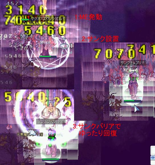 超弱いFW。 慣れてきたと思っていたGD3ですが、まだ先があったようです。効率を上げるために無駄を省こうと普段の動きで余裕のある部分を探してみました。 まずは交戦時間のほとんどを占める詠唱時間。これはサンクとMEを併用しているため削るのが難しいところですが、サンクを設置しなければぐっと時間短縮ができるはずです。次に索敵。これはテレポで良さそうな場所を飛び回ることも選択肢ですが、やはりアスムがない以上は囲まれることを避けるために地道に歩くのが上策。最後にMEが消えた後の再支援短縮がポイントでしょうか。 まずはサンクの使い方を。さすがにMEを削るわけにはゆかないので、無駄なサンクを削ってみました。 これまでは、ホドレム2匹と他3匹程度を目安にサンク+ME設置を基本としていましたが、ホドレムってそんなにいないんですよね。馬ばっかり5匹くらいの時もあるので、その場合には無駄に引きずった挙句にサンクの回復力が大きすぎるという空振りも目立ちました。そこで、サンクなしを前提にどこまでがんばれるかを基準にしてみたところ、ホドレム1匹と馬3くらいならなんとかいけそうな雰囲気。 そこからは、耐えられるだけを直MEで焼いて、周囲のMobを引き込むスタイルで進めました。これは湧きの激しいGD3ではかなり有効でした。また、バックサンクがなく位置ずれを気にする必要もないので、SP吸収を耐えることなくMEの範囲内をぐるぐると逃げ回ることで被ダメ減少の効果もありました。MEの威力としては、ホドレム、デビルチ、馬はME2セットで沈むので楽ですが、どうしても残ってしまうのがテラ馬でした。