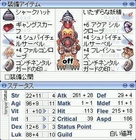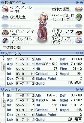 Matkについては、floor(floor(Matk*1.15)*1.1)の計算になっているようです。floor()は小数点以下切捨ての演算。 種族耐性とかの計算式では+15%+10%で+25%になりそうですが、ディバインクロスとスピリンのセットでは+26%の計算になっているのが不思議なところ。でも、大きいことはいいことなので追求しない方向でー。 さて、狩りの方はどうかというと、あまり変化がありませんでした。時給計算も2.7M/h相当(30分計測)でしたし、消耗品もほぼ同じ。やや青石の消費が多かったですが、10個程度なので誤差かと…。実際のステで変化した箇所をまとめてみました。