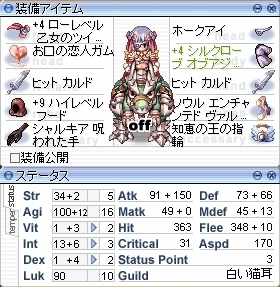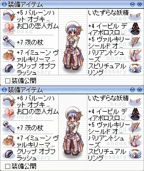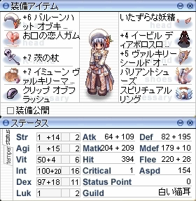 これでもはや形だけではなくなった。 長くお世話になっていたマジックアイズから、見た目重視でバルーンハットにしてしばらく。性能を考えると、+5カトリバルーンは、マジックアイズに勝てる部分がぜんぜんありませんでした。そしてバルーンハット熱も覚めてきて、そろそろ何かやりたい気分に。 聞くところによると、サーバ統合されるということで、これもひとつの転機かなと思い、バルーンハットを精錬してみることにしました。とはいえ、2段階の過剰は危険なので、+5→+6の1回だけです。成功率は40%らしいので、壊れることも、ままあることでしょうー。ということで、結果がこちら。