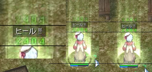 ヒール数値に合わせて指示線を用意してみましたが、中央と右側を見ても、微妙に違うかな…という程度。左側が、中央の数値部分を拡大したものですが、拡大してよくよく見てみると、1ドット分の隙間が確認できました。このことから、エキスパートリングを装備した方がヒール間隔が短いと言える★かもしれません★。
