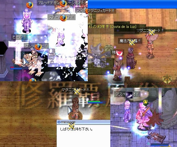 そんな中、たまたまAgiLKにからまれていたWizさんを支援していると、入り口近辺の掃除が終わったのか、味方のプリさんも寄ってきてぼっこぼこ返しです。