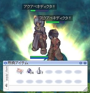 空き瓶をケミに持たせ、2人のプリに分配すると、両手でひたすら聖水作成のキーを押し続けです。キーボード壊れるんじゃないかという勢いですが、製薬時の酷使に比べればまだまだ。
