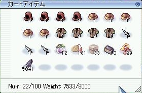 その原因がビール帽。よくドロップすると聞いていたのですが、たしかに、多い。30分でとうもろこし5個、ソーセージ3個、きのこ5個と大量でした。しかも、きのことか、重量とんでもなく重いので、こやつが主たる原因なのでしょう。きのこめ! とうもろこしドロップは低め(0.5%?)ということなので、今回が多すぎたのでしょう。ソヒードロップから計算すると、とうもろこし1個、ソーセージ2個、きのこ4個というところのようです。つまり、重量の大きな比重を占めるきのこは、期待値通りに出て、普通に重量を圧迫する…と。ミミックアクセに比べると、非常に多くドロップを期待でき、実際に拾う数も目に見えるレベルなのは楽しいのですが、主目的である馬牌やマステラ酒の産出を阻害するのはちょっと考え物です。しかし、こやつめ、悩ましいものよー。 ついしん。さっき露店見たら、がらぱご帽800kで売ってたよ! |