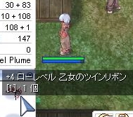 と、無駄に土精カードなど出しつつ、狩りをしています。ここではプリ追尾はせず、敵の密度の低い場所まで歩いたらテレポで位置を変更して密度の高い方へ歩くというスタイルです。そのため、SP増強の装備をしています。DS向け…というよりブラギ向けのステで、現在Dex60Int60。回復のためにエギラシューズと、青オシ乙女ツインの組み合わせです。