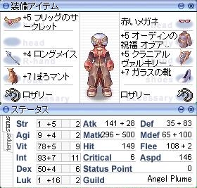 そして何を思ったか、エルニウムを5個にぎりしめてプロンテラの破壊神の元へ…。そしたら見事に+5フリッグのサークレットができちゃいました。精錬値がMdefとして反映されるため、+5精錬で数字もきれいに揃うことに。